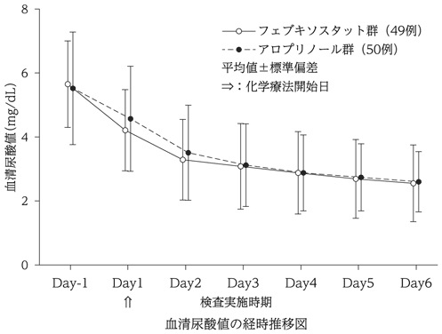化学療法施行予定の悪性腫瘍患者99例を対象にアロプリノール対照非盲検無作為化比較試験を行った。フェブキソスタット60mg/日又はアロプリノールは300mg/日[腎機能障害のある患者(30≦eGFR<45mL/min/1.73m2)では200mg/日]を化学療法施行開始24時間前から6日間投与した。投与開始6日後までの血清尿酸値AUC(主要評価項目)は、アロプリノール群に対するフェブキソスタット群の非劣性が示された(非劣性マージンは150mg・h/dL)。また、フェブキソスタット60mg/日の投与により血清尿酸値は投与開始6日後まで経時的に減少した31),32)。本試験におけるフェブキソスタット60mg/日の安全性評価対象49例中1例(2.0%)に副作用が認められた。その副作用は、AST増加、ALT増加であった。