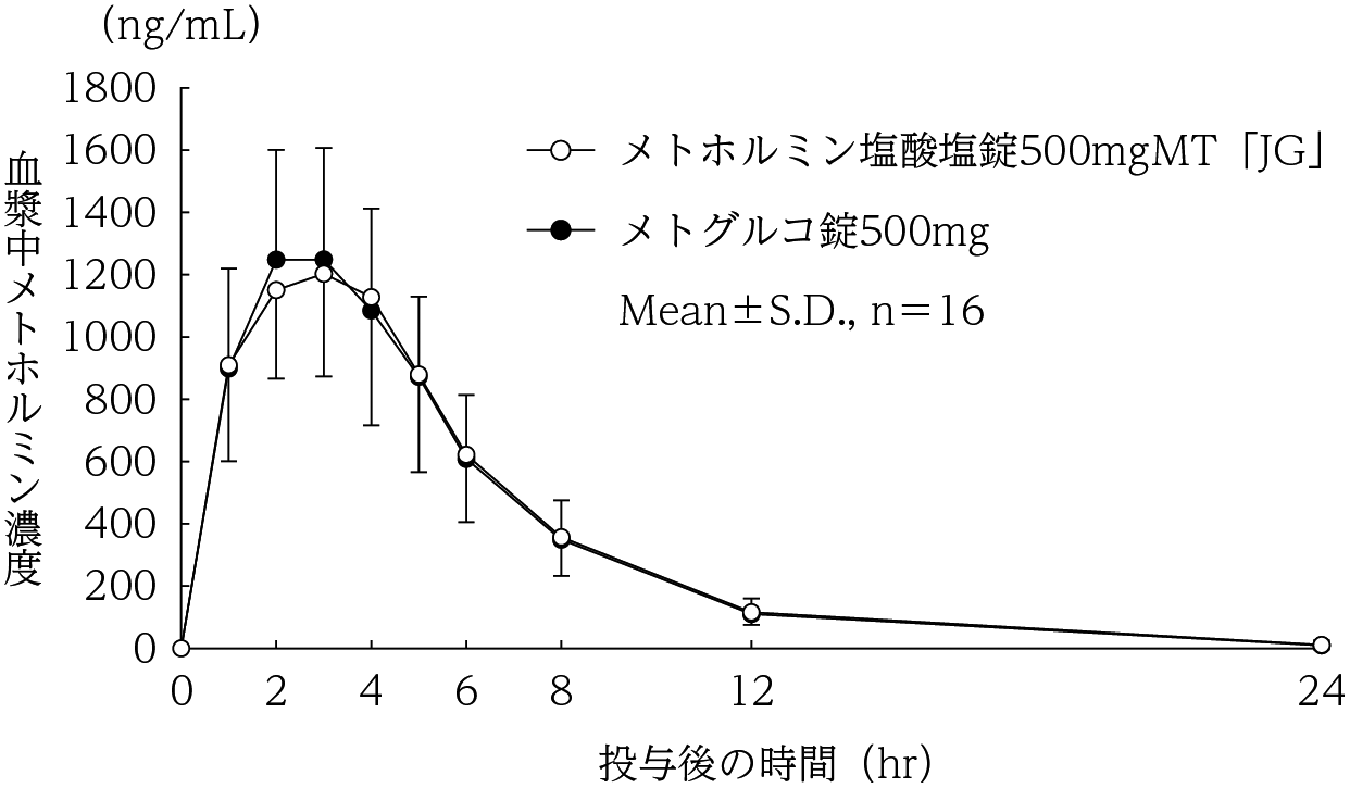 メトホルミン塩酸塩錠250mgMT「JG」は、「含量が異なる経口固形製剤の生物学的同等性試験ガイドライン(平成24年2月29日 薬食審査発0229第10号 別紙2)」に基づき、メトホルミン塩酸塩錠500mgMT「JG」を標準製剤とした溶出試験の結果、溶出挙動は同等と判定され、生物学的に同等とみなされた18) 。