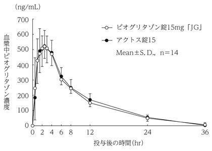 ピオグリタゾン錠15mg「JG」とアクトス錠15を、クロスオーバー法によりそれぞれ1錠(ピオグリタゾンとして15mg)健康成人男子に絶食単回経口投与して血漿中未変化体濃度を測定し、得られた薬物動態パラメータ(AUC、Cmax)について90%信頼区間法にて統計解析を行った結果、log(0.80)~log(1.25)の範囲内であり、両剤の生物学的同等性が確認された9)。