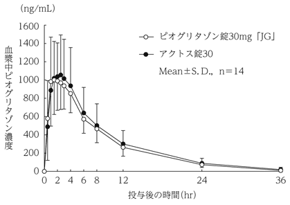 ピオグリタゾン錠30mg「JG」とアクトス錠30を、クロスオーバー法によりそれぞれ1錠(ピオグリタゾンとして30mg)健康成人男子に絶食単回経口投与して血漿中未変化体濃度を測定し、得られた薬物動態パラメータ(AUC、Cmax)について90%信頼区間法にて統計解析を行った結果、log(0.80)~log(1.25)の範囲内であり、両剤の生物学的同等性が確認された10)。