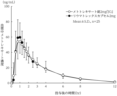 メトトレキサート錠2mg「JG」とリウマトレックスカプセル2mgを、クロスオーバー法によりそれぞれ1錠または1カプセル(メトトレキサートとして2mg)健康成人男性に絶食単回経口投与して血漿中未変化体濃度を測定した。得られた薬物動態パラメータ(AUC、Cmax)について90%信頼区間法にて統計解析を行い、生物学的同等性を検証した。AUCは判定基準log(0.80)~log(1.25)の範囲内であった。Cmaxはlog(0.80)~log(1.25)の範囲外であったが、対数値の平均値の差は判定基準log(0.90)~log(1.11)の範囲内にあり、かつ、「後発医薬品の生物学的同等性試験ガイドライン(平成24年2月29日 薬食審査発0229第10号 別紙1)」に従った溶出試験で溶出挙動が類似していたことから、生物学的に同等であると判定された4)。