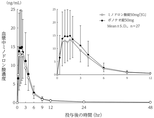 ミノドロン酸錠50mg「JG」とボノテオ錠50mgを、クロスオーバー法によりそれぞれ1錠(ミノドロン酸水和物として50mg)健康閉経後女性に絶食単回経口投与して血漿中未変化体濃度を測定し、得られた薬物動態パラメータ(AUC、Cmax)について90%信頼区間法にて統計解析を行った結果、log(0.80)~log(1.25)の範囲内であり、両剤の生物学的同等性が確認された4)。