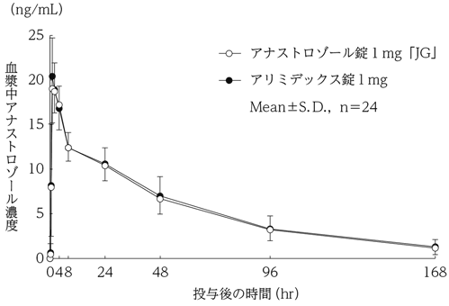 アナストロゾール錠1mg「JG」とアリミデックス錠1mgを、クロスオーバー法によりそれぞれ1錠(アナストロゾールとして1mg)閉経後健康女性に絶食単回経口投与して血漿中未変化体濃度を測定し、得られた薬物動態パラメータ(AUC、Cmax)について90%信頼区間法にて統計解析を行った結果、log(0.80)~log(1.25)の範囲内であり、両剤の生物学的同等性が確認された3)。