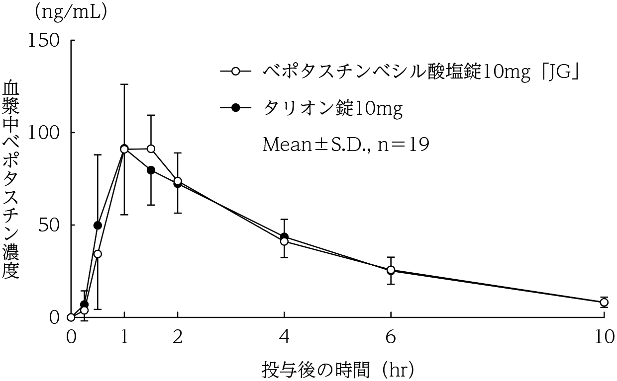 ベポタスチンベシル酸塩錠10mg「JG」とタリオン錠10mgを、クロスオーバー法によりそれぞれ1錠(ベポタスチンベシル酸塩として10mg)健康成人男性に絶食単回経口投与して血漿中未変化体濃度を測定し、得られた薬物動態パラメータ(AUC、Cmax)について90%信頼区間法にて統計解析を行った結果、log(0.80)~log(1.25)の範囲内であり、両剤の生物学的同等性が確認された4) 。