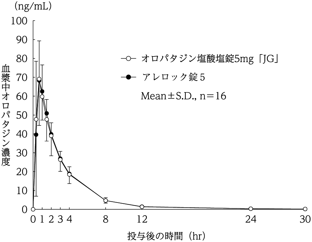 オロパタジン塩酸塩錠5mg「JG」とアレロック錠5を、クロスオーバー法によりそれぞれ1錠(オロパタジン塩酸塩として5mg)健康成人男性に絶食単回経口投与して血漿中未変化体濃度を測定し、得られた薬物動態パラメータ(AUC、Cmax)について90%信頼区間法にて統計解析を行った結果、log(0.80)~log(1.25)の範囲内であり、両剤の生物学的同等性が確認された3) 。
