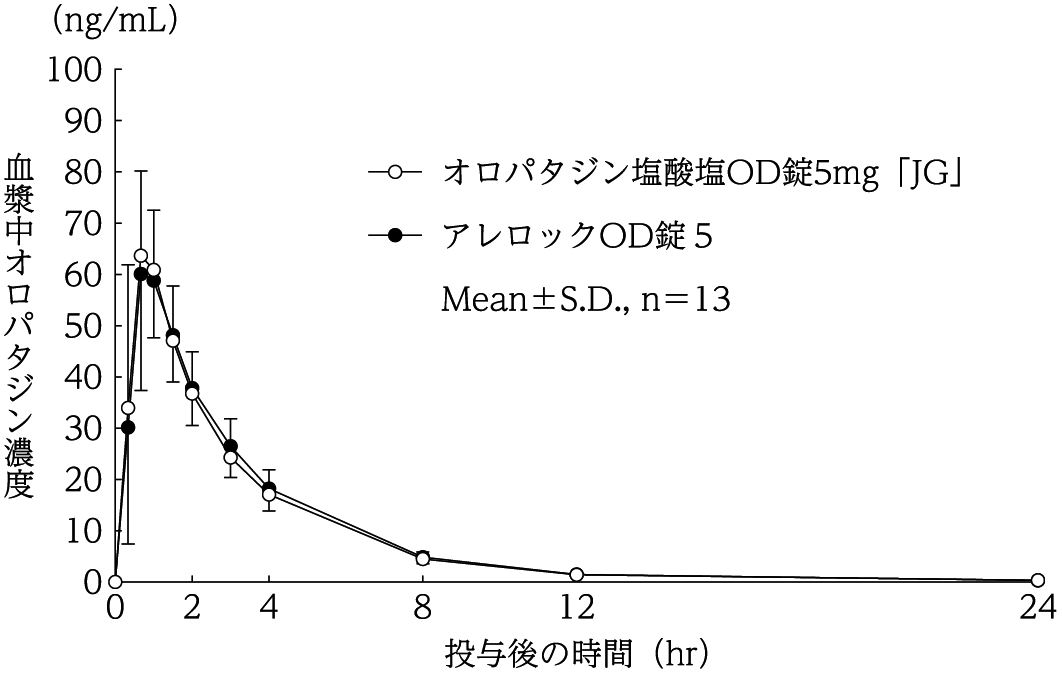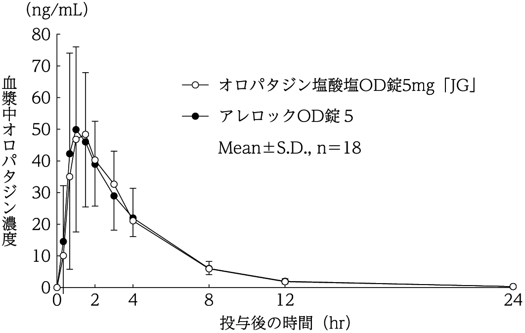 オロパタジン塩酸塩OD錠5mg「JG」とアレロックOD錠5を、クロスオーバー法によりそれぞれ1錠(オロパタジン塩酸塩として5mg)健康成人男性に水あり及び水なしで絶食単回経口投与して血漿中未変化体濃度を測定し、得られた薬物動態パラメータ(AUC、Cmax)について90%信頼区間法にて統計解析を行った結果、log(0.80)~log(1.25)の範囲内であり、両剤の生物学的同等性が確認された3) 。