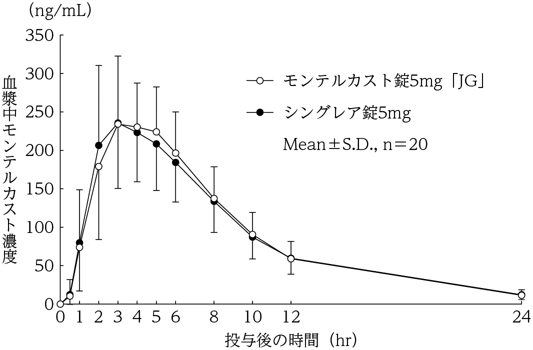 モンテルカスト錠5mg「JG」とシングレア錠5mgを、クロスオーバー法によりそれぞれ1錠(モンテルカストとして5mg)健康成人男性に絶食単回経口投与して血漿中未変化体濃度を測定し、得られた薬物動態パラメータ(AUC、Cmax)について90%信頼区間法にて統計解析を行った結果、log(0.80)~log(1.25)の範囲内であり、両剤の生物学的同等性が確認された4) 。