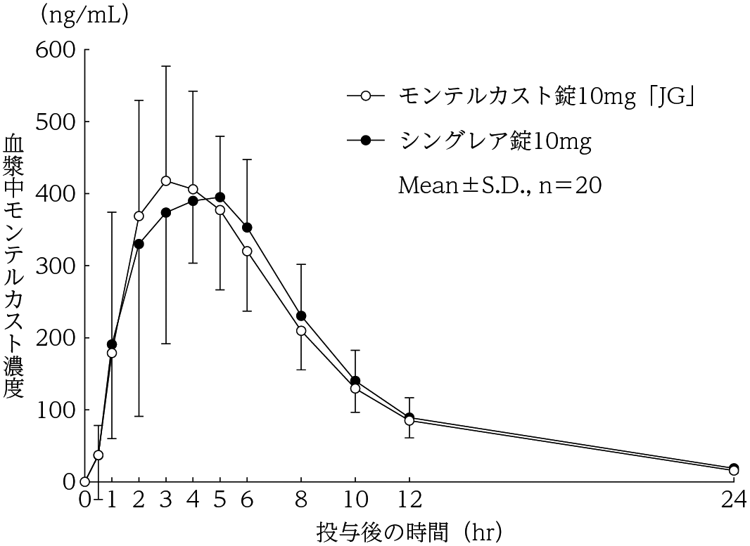 モンテルカスト錠10mg「JG」とシングレア錠10mgを、クロスオーバー法によりそれぞれ1錠(モンテルカストとして10mg)健康成人男性に絶食単回経口投与して血漿中未変化体濃度を測定し、得られた薬物動態パラメータ(AUC、Cmax)について90%信頼区間法にて統計解析を行った結果、log(0.80)~log(1.25)の範囲内であり、両剤の生物学的同等性が確認された5) 。