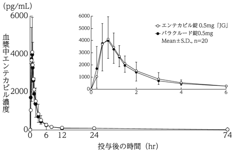 エンテカビル錠0.5mg「JG」とバラクルード錠0.5mgを、クロスオーバー法によりそれぞれ1錠(エンテカビルとして0.5mg)健康成人男子に絶食単回経口投与して血漿中未変化体濃度を測定し、得られた薬物動態パラメータ(AUC、Cmax)について90%信頼区間法にて統計解析を行った結果、log(0.80)~log(1.25)の範囲内であり、両剤の生物学的同等性が確認された3)。