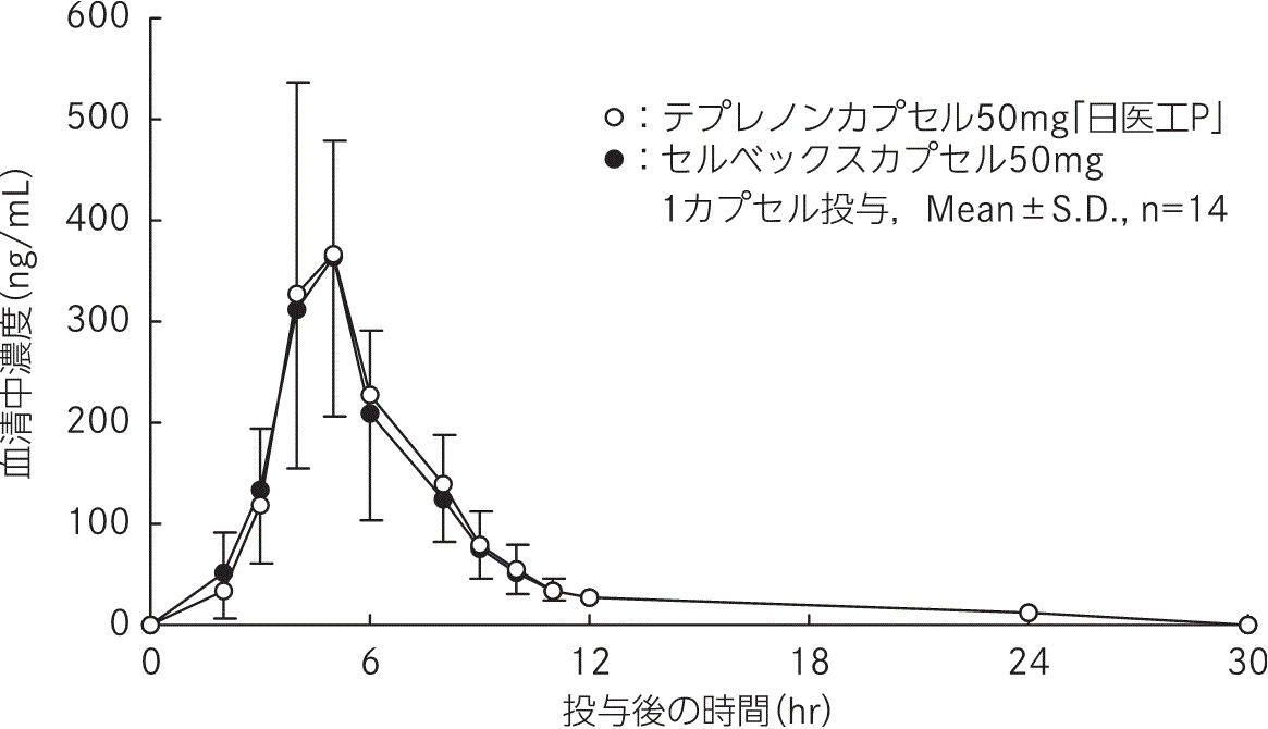 テプレノンカプセル50mg「日医工P」とセルベックスカプセル50mgを、クロスオーバー法によりそれぞれ1カプセル(テプレノンとして50mg)健康成人男子に食後単回経口投与して血清中未変化体濃度を測定し、得られた薬物動態パラメータ(AUC、Cmax)について統計解析を行った結果、両剤の生物学的同等性が確認された1)。