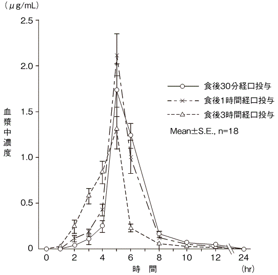 健康成人男子(18名)にテプレノン3カプセル(テプレノンとして150mg注1))をクロスオーバー法で食後30分、1時間及び3時間に経口投与し、血漿中濃度を測定し、下図及び下表に示した。血漿中濃度曲線下面積(AUC)は食後30分投与を100%とすると、食後1時間投与では変化なく、食後3時間投与では約23%低下した2)。