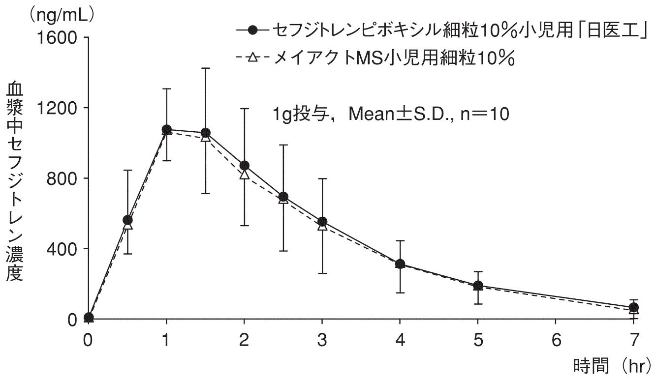 セフジトレンピボキシル細粒10%小児用「日医工」及びメイアクトMS小児用細粒10%を、クロスオーバー法によりそれぞれ1g(セフジトレンピボキシルとして100mg(力価))健康成人男子に絶食単回経口投与して血漿中セフジトレン濃度を測定し、得られた薬物動態パラメータ(AUC、Cmax)について90%信頼区間法にて統計解析を行った結果、log(0.8)~log(1.25)の範囲内であり、両剤の生物学的同等性が確認された3)。