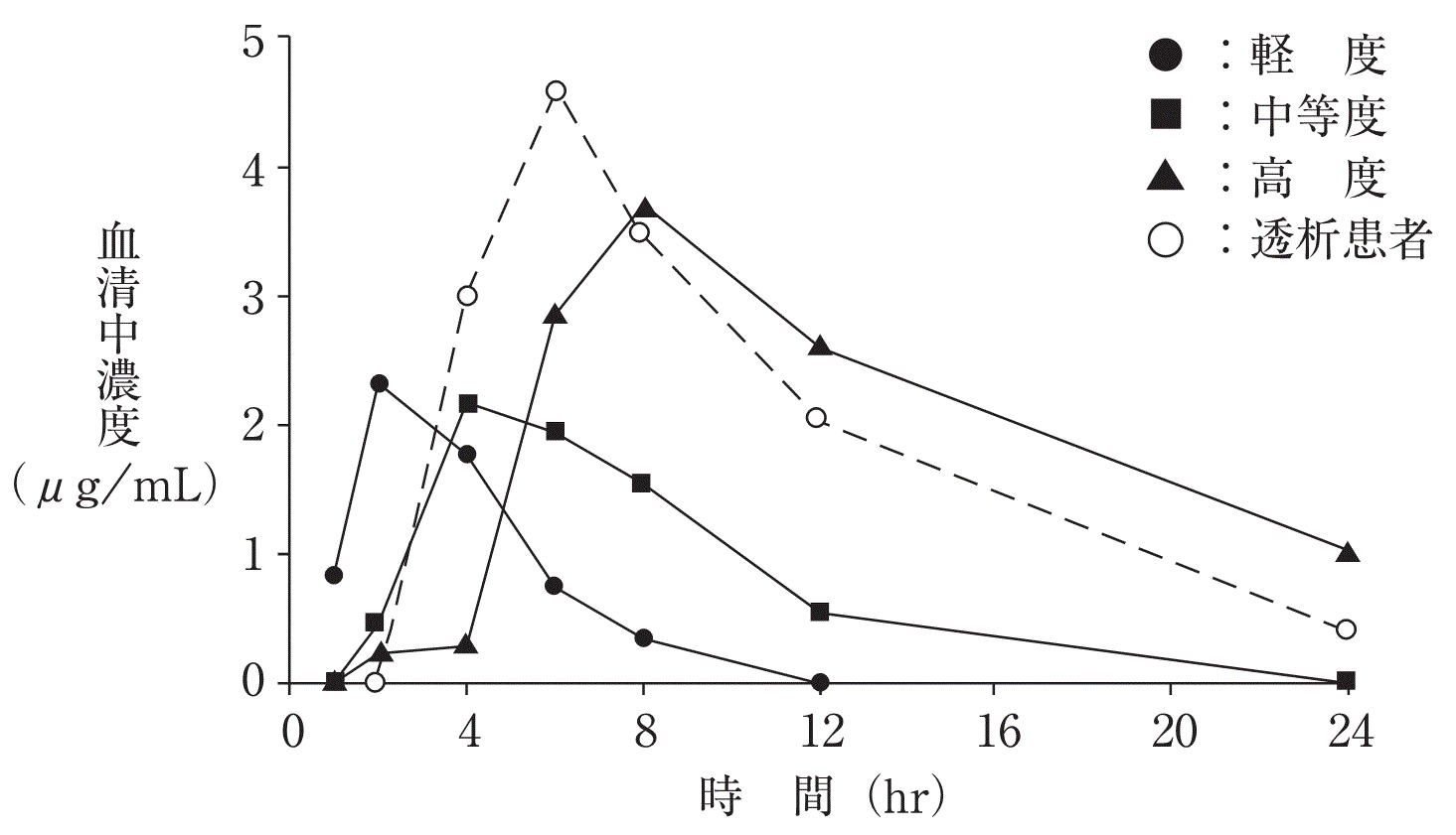 腎機能障害患者及び人工透析導入患者(いずれも成人)に200mgを食後単回経口投与した場合、セフジトレンの血清中濃度・薬物動態パラメータは、図2・表2のとおりであり、いずれの場合も高値で推移し、腎機能の障害の程度に応じたT1/2の遅延が認められた。また、尿中排泄率は腎機能の障害の程度が大きくなるにつれて低下し、排泄の遅延が認められた4)。,