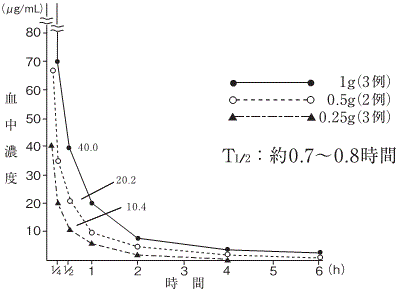 主として腎より排泄され、成人(腎機能正常者)に1回0.5、1、2g静注あるいは点滴静注後6時間までの尿中排泄率は約60~85%である。また、0.5gを静注後の尿中濃度は0~2時間で約2,000μg/mL、2~4時間で約350μg/mL、4~6時間で約66μg/mLを示す3),4)。小児(腎機能正常者)に1回10、20、40mg/kg静注あるいは点滴静注後6時間までの尿中排泄率は、成人とほぼ同様である5),6),7)。