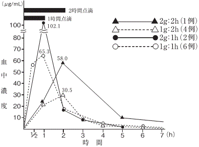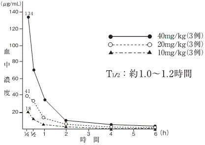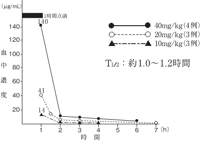 腎機能正常の成人及び小児に静注あるいは点滴静注して得られた血中濃度は以下のとおりであり、用量依存性を示す3),4),5),6),7),8),9),10),11)。