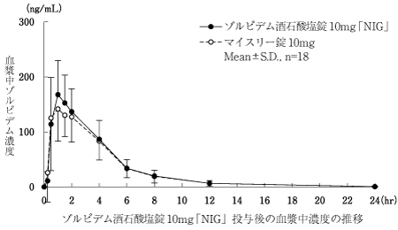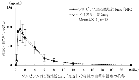 ゾルピデム酒石酸塩錠5mg「NIG」又はゾルピデム酒石酸塩錠10mg「NIG」とマイスリー錠5mg又はマイスリー錠10mgをクロスオーバー法により、それぞれ1錠(ゾルピデム酒石酸塩として5mg又は10mg)を健康成人男子に空腹時単回経口投与して血漿中未変化体濃度を測定し、得られた薬物動態パラメータ(AUC、Cmax)について統計解析を行った結果、両剤の生物学的同等性が確認された2)。