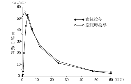 健康成人8例にデパケン錠600mg(200mgを1回3錠)を空腹時及び食後に単回経口投与したとき、空腹時投与と比べて食後投与では吸収速度定数及びCmaxの有意な低下、tmaxの有意な延長が認められた10)。