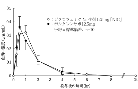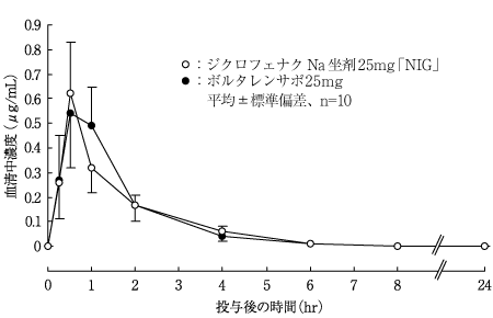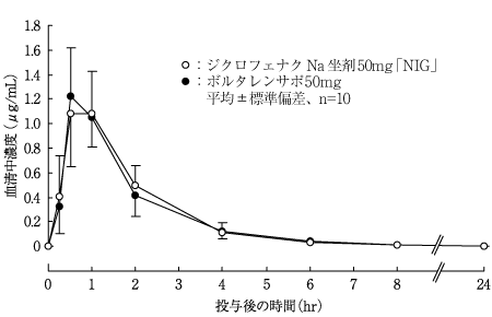 健康成人にジクロフェナクナトリウム坐剤25mg及び50mgを朝食1時間後に単回直腸投与した場合の薬物動態パラメータは以下のとおりであった5)。