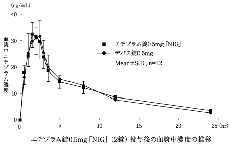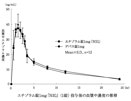 エチゾラム錠0.5mg「NIG」又はエチゾラム錠1mg「NIG」とデパス錠0.5mg又はデパス錠1mgをクロスオーバー法により、それぞれ2錠又は1錠(エチゾラムとして1mg)を健康成人に空腹時単回経口投与して血漿中未変化体濃度を測定し、得られた薬物動態パラメータ(AUC、Cmax)について統計解析を行った結果、両剤の生物学的同等性が確認された2)。