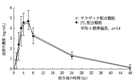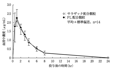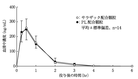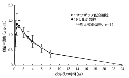 サラザック配合顆粒とPL配合顆粒を、クロスオーバー法によりそれぞれ1g(サリチルアミド270mg、アセトアミノフェン150mg、無水カフェイン60mg、プロメタジンメチレンジサリチル酸塩13.5mg)健康成人男子に絶食単回経口投与して血清中未変化体濃度を測定し、得られた薬物動態パラメータ(AUC、Cmax)について統計解析を行った結果、両剤の生物学的同等性が確認された6)。