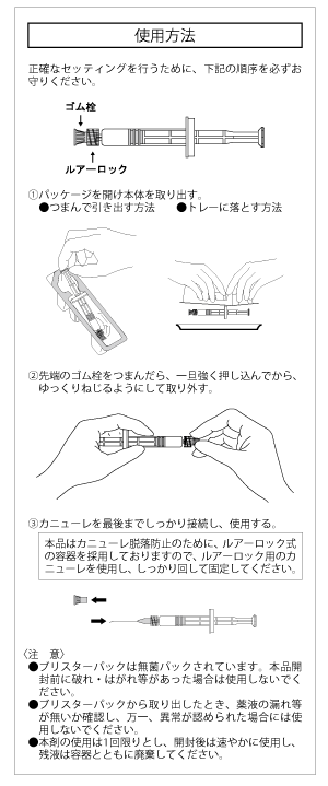 眼内レンズ挿入術:眼内レンズ挿入前に、通常0.1~0.5mLを前房内へ注入する。また、眼内レンズのコーティングに約0.1mL使用する。