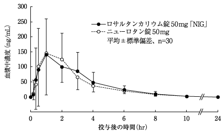 健康成人にロサルタンカリウム25及び50mgを空腹時に1回経口投与した場合、ロサルタン及びカルボン酸体の血漿中濃度はそれぞれ投与約1時間及び約3時間でピークに達し、半減期は約2時間及び約4時間であり、カルボン酸体のAUC(血漿中濃度曲線下面積)はロサルタンの約7倍であった5)。