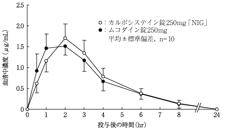 カルボシステインとして、通常成人1回500mgを1日3回経口投与する。なお、年齢、症状により適宜増減する。