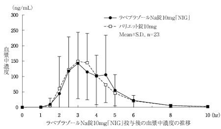 通常、成人にはラベプラゾールナトリウムとして1回10mgを1日1回経口投与する。なお、通常、4週間までの投与とする。