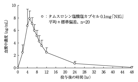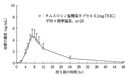 健康成人にタムスロシン塩酸塩カプセルを0.1~0.6mg注1)経口投与したとき、血漿中未変化体濃度は投与後7~8時間にピークを示し、半減期は9.0~11.6時間であった1)。Cmax及びAUCは投与量にほぼ比例して上昇した。タムスロシン塩酸塩カプセルを7日間連続経口投与したとき、半減期はやや延長したが、血漿中未変化体濃度推移は4日目で定常状態に達した2)。