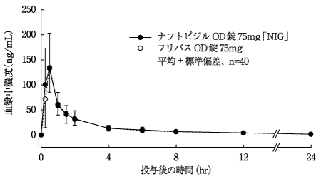 ナフトピジルOD錠75mg「NIG」とフリバスOD錠75mgを、クロスオーバー法によりそれぞれ1錠(ナフトピジルとして75mg)健康成人男子に水なしで絶食単回経口投与して血漿中未変化体濃度を測定し、得られた薬物動態パラメータ(AUC、Cmax)について90%信頼区間法にて統計解析を行った結果、log(0.80)〜log(1.25)の範囲内であり、両剤の生物学的同等性が確認された2)。