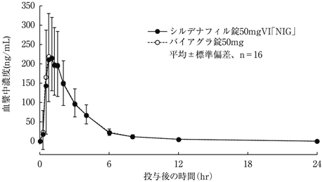 シルデナフィル錠50mgVI「NIG」とバイアグラ錠50mgを、クロスオーバー法によりそれぞれ1錠(シルデナフィルとして50mg)健康成人男子に絶食単回経口投与して血漿中未変化体濃度を測定し、得られた薬物動態パラメータ(AUC、Cmax)について90%信頼区間法にて統計解析を行った結果、log(0.80)~log(1.25)の範囲内であり、両剤の生物学的同等性が確認された13)。