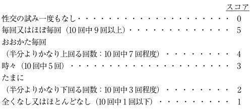 主として臨床効果はIIEF(International Index of Erectile Function:国際勃起機能スコア)質問票(15質問)のうち、挿入の頻度に関する質問「ここ4週間、性交を試みた時、何回挿入することができましたか?」及び勃起の維持に関する質問「ここ4週間、性交中、挿入後何回勃起を維持することができましたか?」により行い、以下のスコアで評価した。
