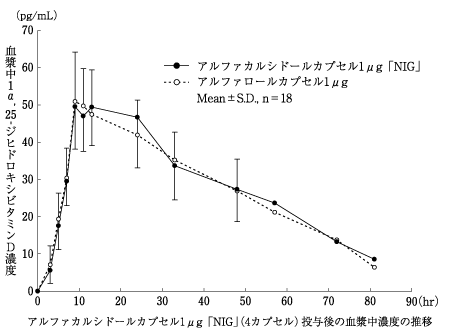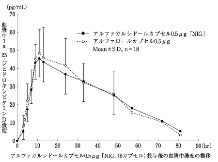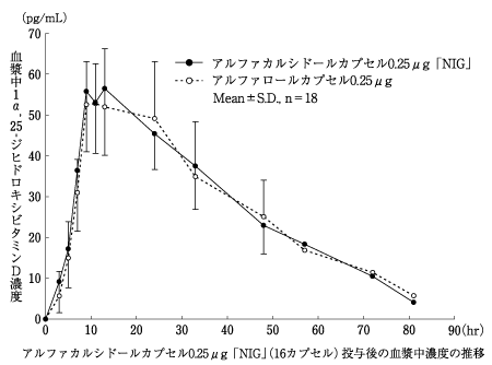 アルファカルシドールカプセル0.25μg「NIG」、アルファカルシドールカプセル0.5μg「NIG」又はアルファカルシドールカプセル1μg「NIG」とアルファロールカプセル0.25μg、アルファロールカプセル0.5μg又はアルファロールカプセル1μgをクロスオーバー法により、それぞれアルファカルシドールとして4μgを健康成人に空腹時単回経口投与して血漿中1α,25-ジヒドロキシビタミンD濃度を測定し、得られた薬物動態パラメータ(AUC、Cmax)について統計解析を行った結果、両剤の生物学的同等性が確認された2)。