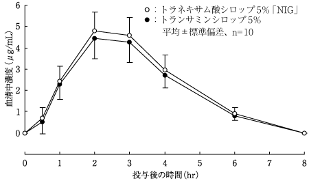 トラネキサム酸シロップ5%「NIG」とトランサミンシロップ5%を、クロスオーバー法によりそれぞれ5mL(トラネキサム酸として250mg)健康成人男子に単回経口投与して血清中未変化体濃度を測定し、得られた薬物動態パラメータ(AUC、Cmax)について統計解析を行った結果、両剤の生物学的同等性が確認された2)。