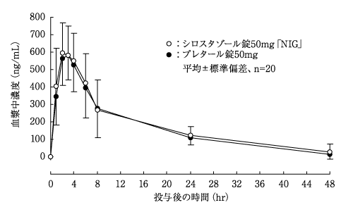 健康成人男性にシロスタゾール50mg注1)を空腹時及び食後に単回経口投与したところ、食後投与の方が空腹時投与の場合よりCmaxで2.3倍、AUCinfで1.4倍高かった11)。