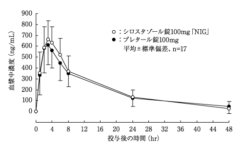 エリスロマイシン500mg(1日3回)を7日間前投与後、シロスタゾール100mgとエリスロマイシン500mg(1日3回)を併用投与したところ、シロスタゾール100mg単独投与に比べてシロスタゾールのCmaxは47%、AUCは87%増加した17)(外国人データ)。