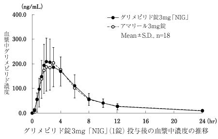 グリメピリド錠1mg「NIG」又はグリメピリド錠3mg「NIG」とアマリール1mg錠又はアマリール3mg錠をクロスオーバー法により、それぞれ1錠(グリメピリドとして1mg又は3mg)を健康成人男子に空腹時単回経口投与して血漿中未変化体濃度を測定し、得られた薬物動態パラメータ(AUC、Cmax)について統計解析を行った結果、log(0.8)〜log(1.25)の範囲内であり、両剤の生物学的同等性が確認された4)。