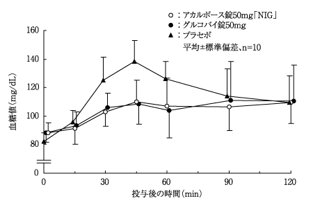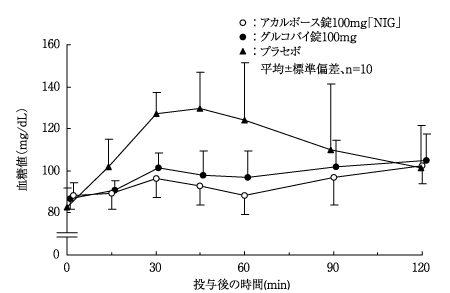 NIDDM患者19例に50mg又は100mgを1日3回毎食事とともに2週間経口投与した場合、血糖日内変動曲線は下方移動し、血糖日内変動曲線下面積は用量依存的に低下する14)。