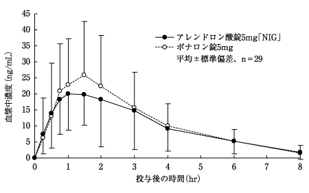 アレンドロン酸錠5mg「NIG」とボナロン錠5mgを、クロスオーバー法によりそれぞれ7錠[アレンドロン酸ナトリウム水和物として45.71mg(アレンドロン酸として35mg)]健康成人男子に絶食単回経口投与して血漿中未変化体濃度を測定し、得られた薬物動態パラメータ(AUC、Cmax)について90%信頼区間法にて統計解析を行った結果、log(0.80)〜log(1.25)の範囲内であり、両剤の生物学的同等性が確認された3)。