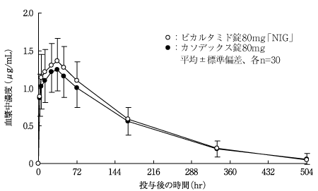 ビカルタミド錠80mg「NIG」又はカソデックス錠80mg1錠(ビカルタミドとして80mg)を、並行群間比較試験法により健康成人男子に絶食単回経口投与して血漿中R-ビカルタミド(活性体)濃度を測定し、得られた薬物動態パラメータ(AUC、Cmax)について90%信頼区間法にて統計解析を行った結果、log(0.80)〜log(1.25)の範囲内であり、両剤の生物学的同等性が確認された5)。