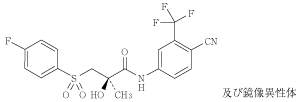 非ステロイド性アンドロゲン受容体拮抗薬であり、標的細胞(前立腺腫瘍組織)中のアンドロゲン受容体の細胞質から核への移行を阻害し、前立腺癌に対する増殖抑制作用を発揮する。本薬の抗アンドロゲン活性は実質的にR体によるものである16)。
