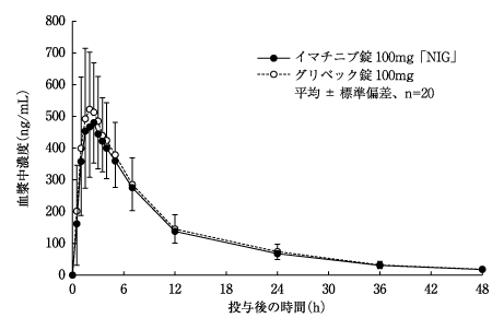 イマチニブ錠100mg「NIG」とグリベック錠100mgをクロスオーバー法により、健康成人男子にそれぞれ1錠(イマチニブとして100mg)を絶食単回経口投与して血漿中未変化体濃度を測定し、得られた薬物動態パラメータ(AUC、Cmax)について90%信頼区間法にて統計解析を行った結果、log(0.80)~log(1.25)の範囲内であり、両剤の生物学的同等性が確認された5)。
