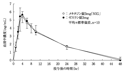 メキタジン錠3mg「NIG」とゼスラン錠3mgを、クロスオーバー法によりそれぞれ2錠(メキタジンとして6mg)健康成人男子に絶食単回経口投与して血清中未変化体濃度を測定し、得られた薬物動態パラメータ(AUC、Cmax)について統計解析を行った結果、両剤の生物学的同等性が確認された3)。