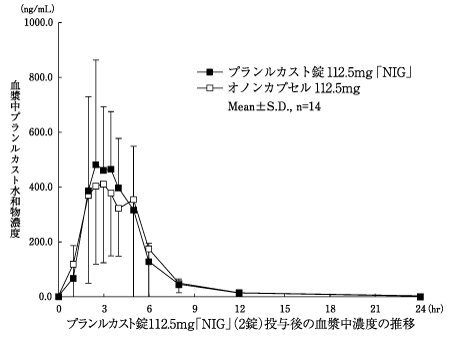 プランルカスト錠225mg「NIG」は、「含量が異なる経口固形製剤の生物学的同等性試験ガイドライン(平成18年11月24日付薬食審査発第1124004号)」に基づき、プランルカスト錠112.5mg「NIG」を標準製剤としたとき、溶出挙動が等しく、生物学的に同等とみなされた2)。