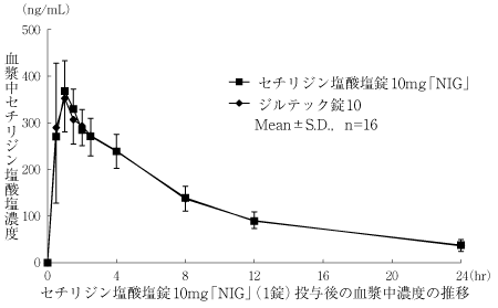 セチリジン塩酸塩錠5mg「NIG」又はセチリジン塩酸塩錠10mg「NIG」とジルテック錠5又はジルテック錠10をクロスオーバー法により、それぞれ2錠又は1錠(セチリジン塩酸塩として10mg)を健康成人男子に空腹時単回経口投与して血漿中未変化体濃度を測定し、得られた薬物動態パラメータ(AUC、Cmax)について統計解析を行った結果、両剤の生物学的同等性が確認された4)。
