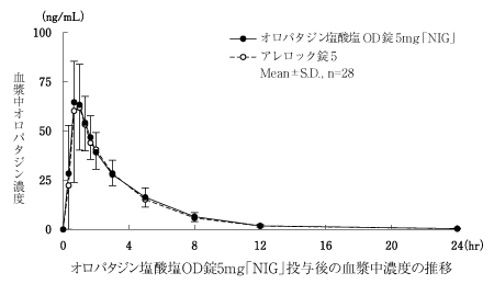 オロパタジン塩酸塩OD錠5mg「NIG」とアレロック錠5をクロスオーバー法により、それぞれ1錠(オロパタジン塩酸塩として5mg)を健康成人男子に空腹時単回経口投与して血漿中未変化体濃度を測定し、得られた薬物動態パラメータ(AUC、Cmax)について統計解析を行った結果、両剤の生物学的同等性が確認された3)。