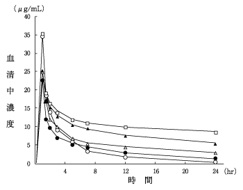 注1)投与量;15~25mg(力価)/kg×5回反復投与、60分点滴承認外用法・用量である。〔本剤の承認された用法・用量は、1回10~15mg(力価)/kgを生後1週までの新生児には12時間ごと、生後1ヵ月までの新生児には8時間ごとに60分以上かけて点滴静注する。〕