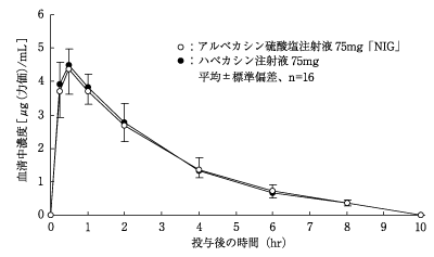 健康成人にアルベカシン硫酸塩200mg(力価)を1時間かけて点滴静注したときの血清中濃度は、図1のとおりで、薬物動態パラメータは、表1のとおりであった。また、75mg(力価)又は100mg(力価)を1時間かけて点滴静注又は筋注したときの薬物動態パラメータは、表1のとおりであった1),2),3),4)。
