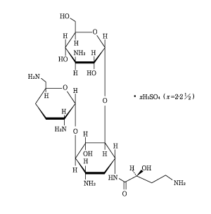 3-Amino-3-deoxy-α-D-glucopyranosyl-(1→6)-[2,6-diamino-2,3,4,6-tetradeoxy-α-D-erythro-hexopyranosyl-(1→4)]-1-N-[(2S)-4-amino-2-hydroxybutanoyl]-2-deoxy-D-streptamine sulfate