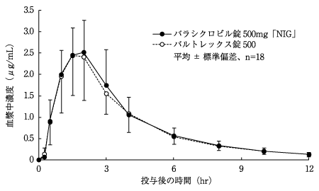 バラシクロビル錠500mg「NIG」とバルトレックス錠500を、クロスオーバー法によりそれぞれ1錠[バラシクロビル塩酸塩として556.21mg(バラシクロビルとして500.00mg)]健康成人男子に絶食単回経口投与して血漿中活性代謝物(アシクロビル)濃度を測定し、得られた薬物動態パラメータ(AUC、Cmax)について90%信頼区間法にて統計解析を行った結果、log(0.80)〜log(1.25)の範囲内であり、両剤の生物学的同等性が確認された6)。